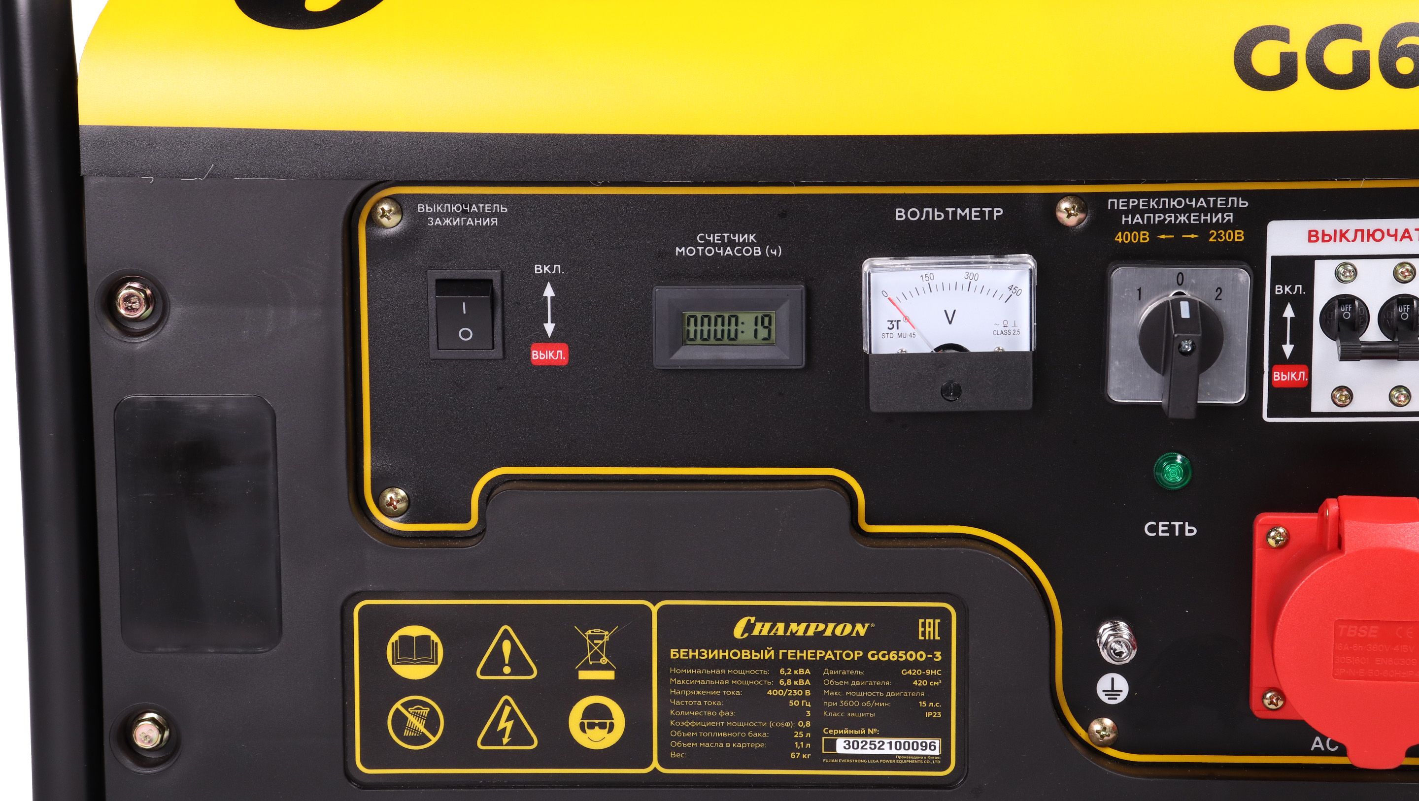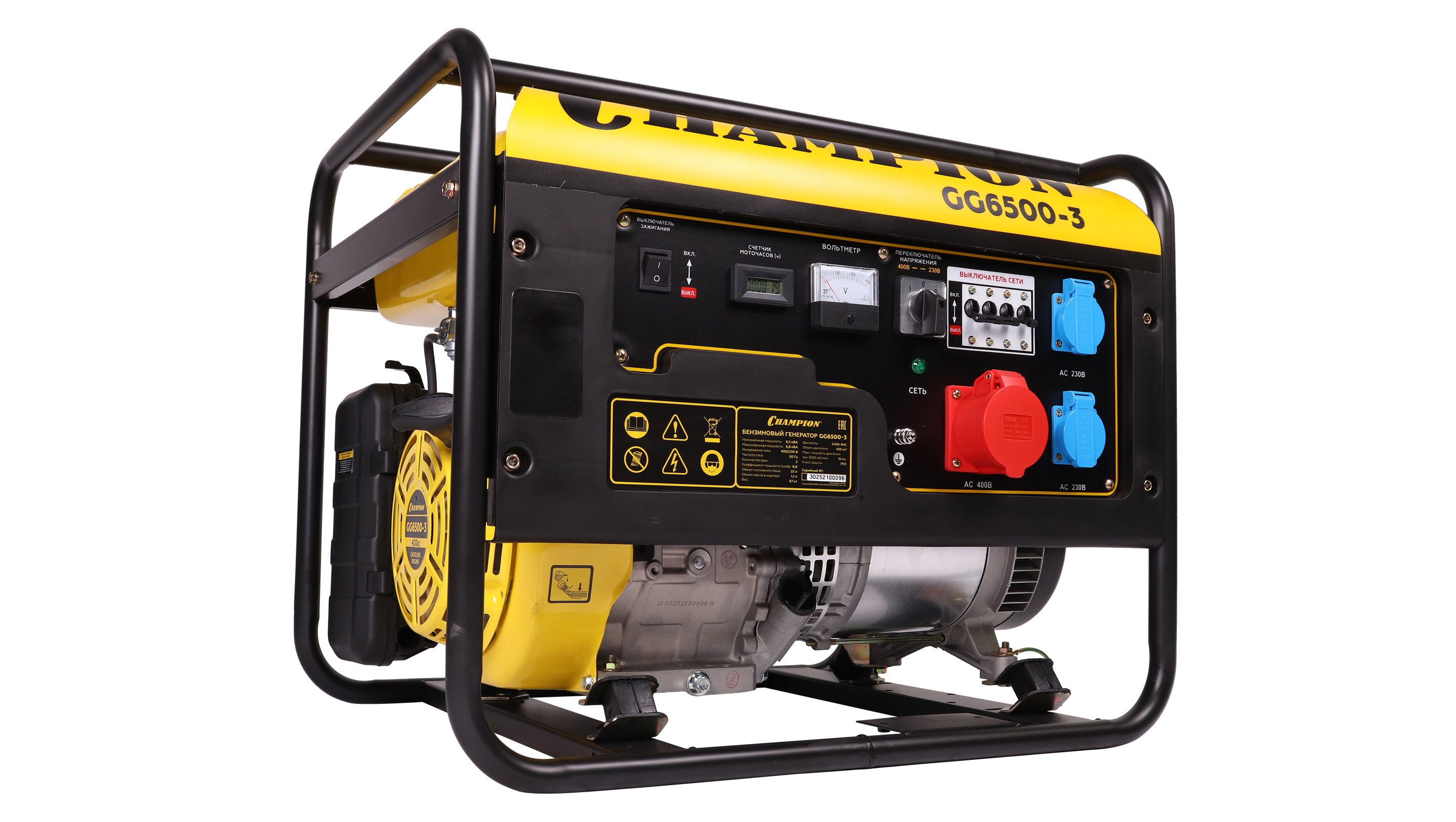 Бензиновый генератор CHAMPION GG6500-3 (400В6,2/6,8кВАcosф=0,8 15лс 25л 67кг) - предназначен для обеспечения электроэнергией в условиях отсутствия основного источника электричества. Он обычно используется как резервный источник питания для дома, офиса или на открытом воздухе.