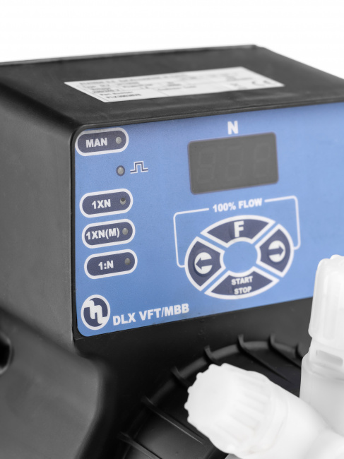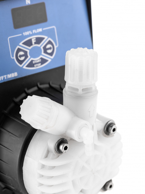 Дозирующий насос Etatron DLX-VFT/MB 05-07 — соленоидный цифровой насос с микропроцессорным управлением и LED-дисплеем, предназначенный для постоянного или пропорционального дозирования реагентов от сигнала внешнего импульсного расходомера, с производительностью до 5 л/час, максимальным давлением 7 бар, мощностью 37 Вт, работающий от сети 230В и имеющий антикислотное исполнение для применения в химической, фармацевтической, пищевой промышленности, водоподготовке и обслуживании бассейнов.