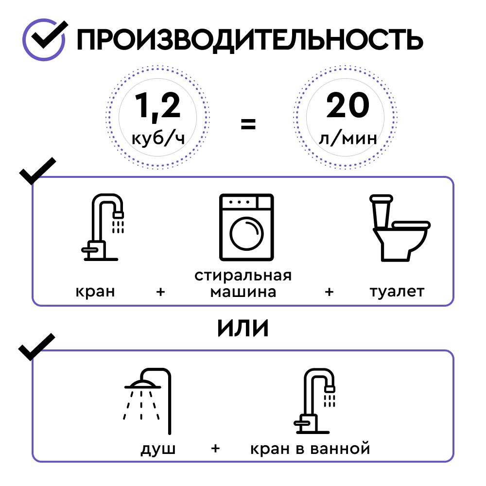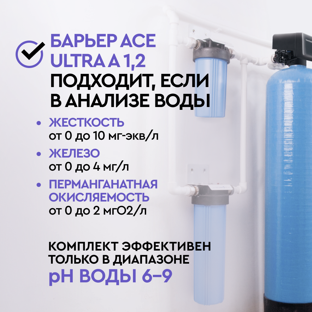 Комплект коттеджной системы БАРЬЕР Ace Ultra А 1,2 (обезжелезивание и умягчение воды) имеет пиковую производительность до 20 л/мин. и подходит для одновременного использования душа и смесителя в ванной или смесителя в ванной комнате, стиральной машины и посудомоечной машины (до 3 точек водоразбора одновременно).