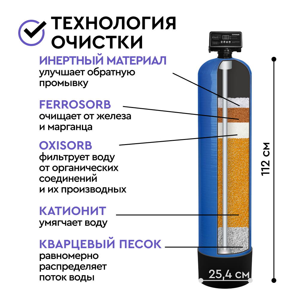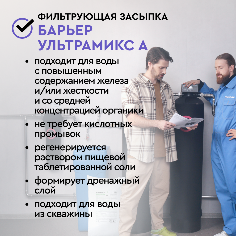 Фильтрующий материал БАРЬЕР УЛЬТРАМИКС А предназначен для удаления из воды избыточной жесткости снижения содержания аммония*, марганца*, органических соединений (перманганатная окисляемость /ПО)*. Финишная очистка фильтром БигБлю избавляет от неприятного запаха и привкуса воду, убирает мутность.