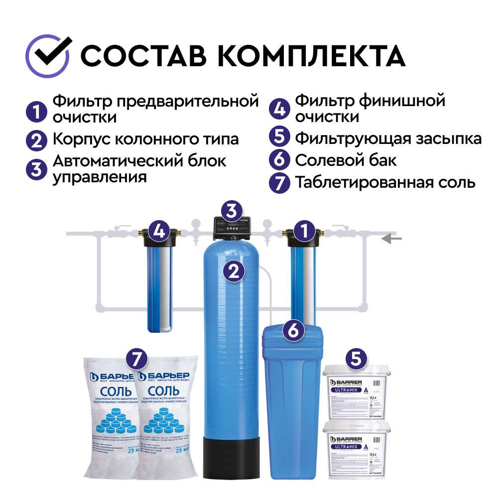 Комплект коттеджной системы БАРЬЕР Ace Ultra А 1,2 (обезжелезивание и умягчение воды) позволяет: