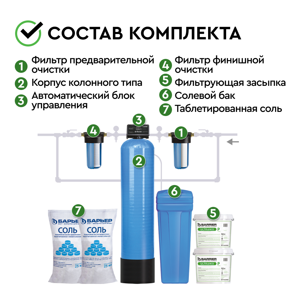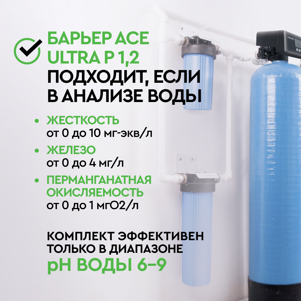 Комплект коттеджной системы БАРЬЕР Ace Ultra P 1,2 (обезжелезивание и умягчение воды) позволяет: