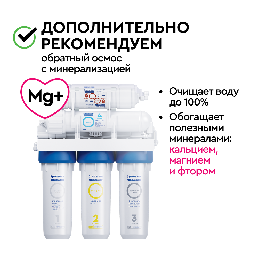 Поры обратноосмотической мембраны сопоставимы с размерами молекул воды, поэтому они задерживают 99,9% примесей: соли жесткости, тяжелые металлы, бактерии, вирусы, опасные химические соединения. Глубокая комплексная очистка и минерализация системы насыщает чистую воду полезными ионами кальция, фтора и магния до физиологической нормы. За счет многоступенчатой очистки позволяет получить воду, не уступающую по качеству бутилированной.