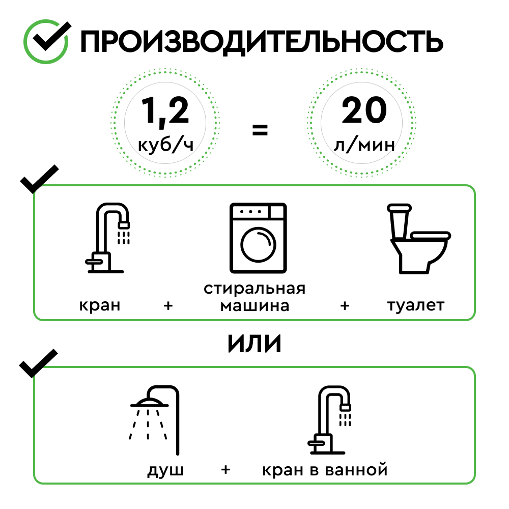Комплект коттеджной системы БАРЬЕР Ace Ultra P 1,2 (обезжелезивание и умягчение воды) имеет пиковую производительность до 20 л/мин. и подходит для одновременного использования душа и смесителя в ванной или смесителя в ванной комнате, стиральной машины и посудомоечной машины (до 3 точек водоразбора одновременно).