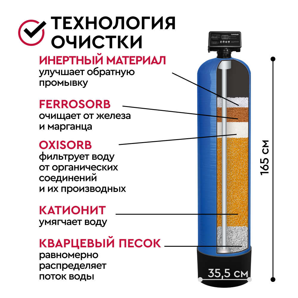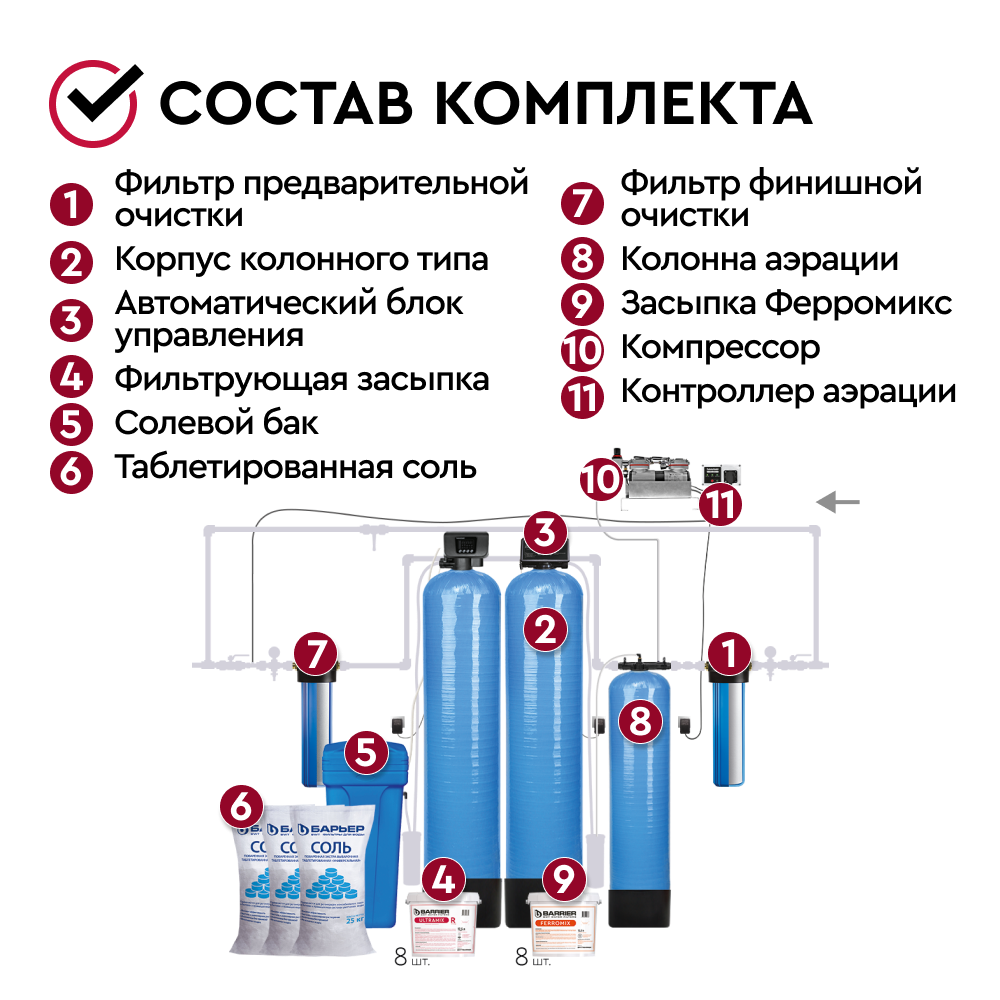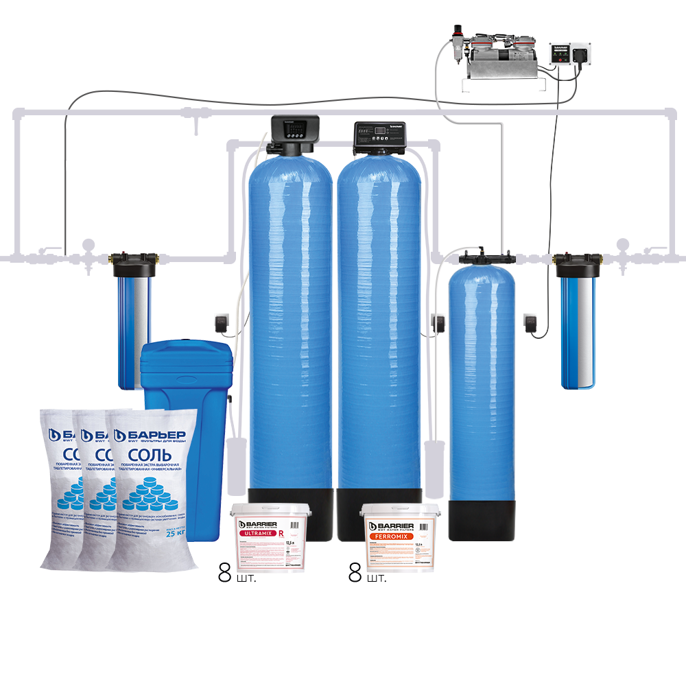 Комплект коттеджной системы БАРЬЕР Ace AERO R 3,0 (аэрация+обезжелезивание и умягчение воды) позволяет: