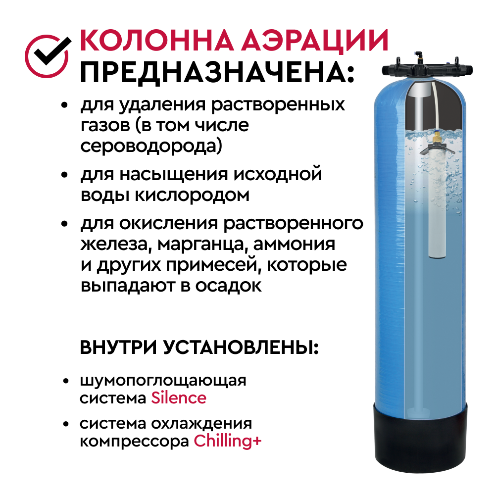 - защитить от растворенного железа, с помощью системы аэрации, входящей в состав комплекта окисляет его и фильтрует на колонне обезжелезивания;