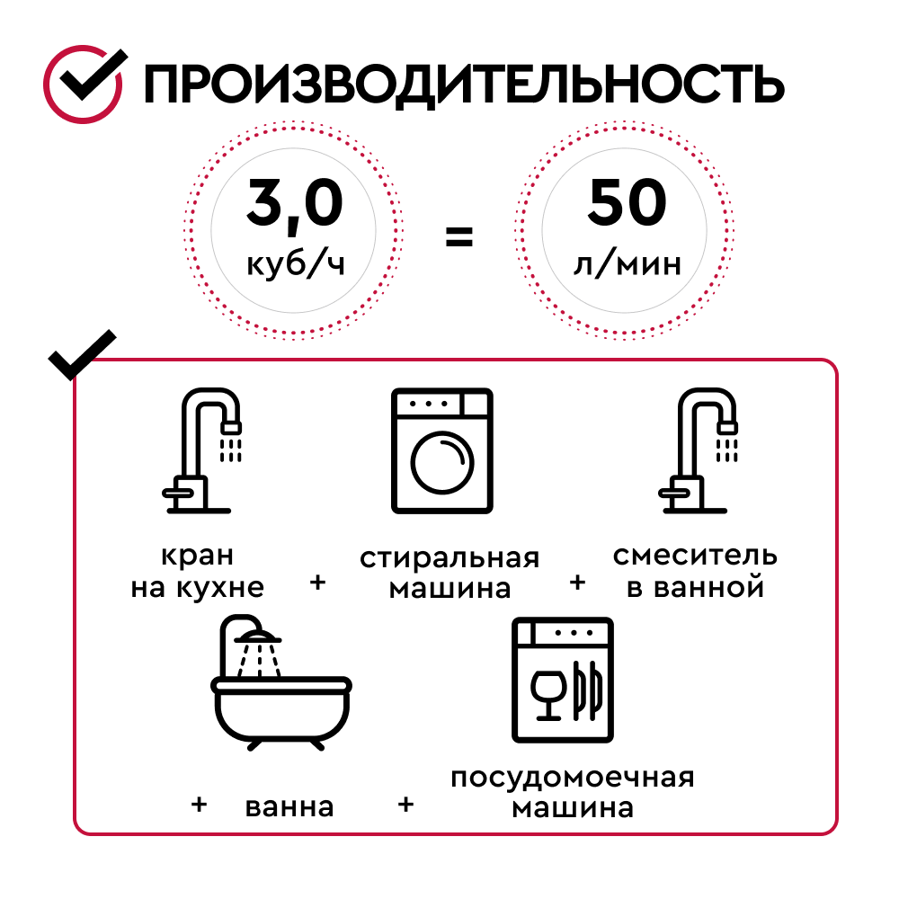 Комплект коттеджной системы БАРЬЕР Ace AERO R 3,0 (аэрация+обезжелезивание и умягчение воды) имеет пиковую производительность до 50 л/мин. и подходит для одновременного использования душа и смесителя в ванной или смесителя в ванной комнате, стиральной машины и посудомоечной машины (до 5 точек водоразбора одновременно).