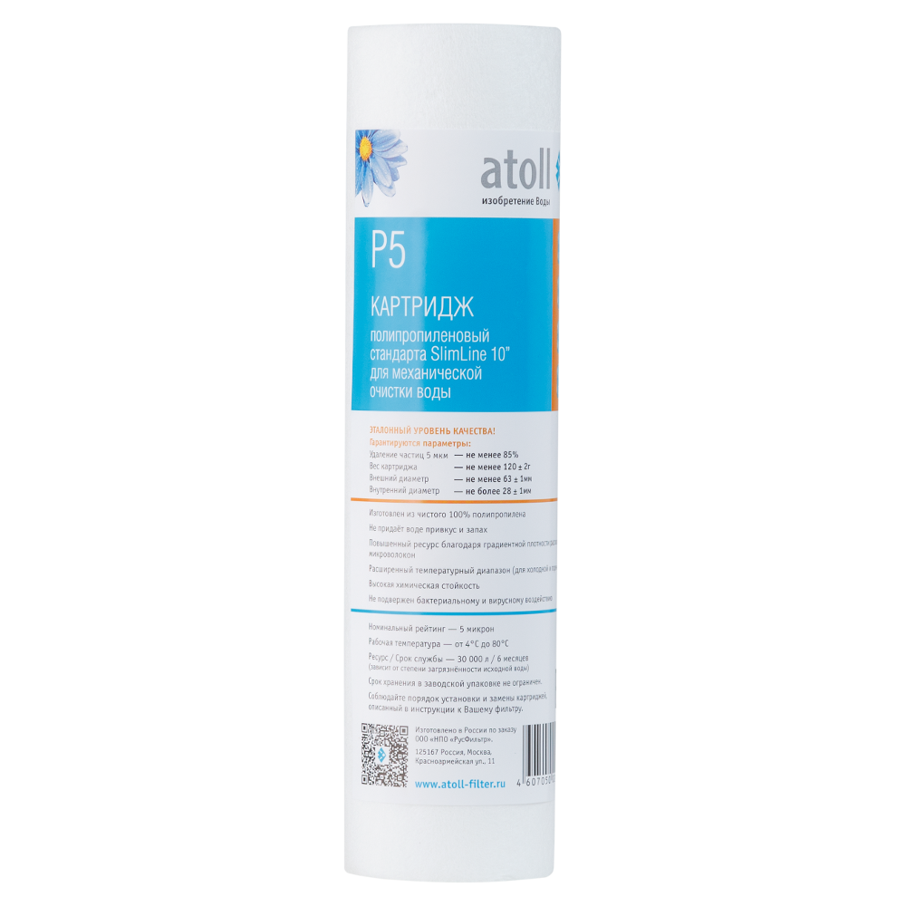 Картридж atoll P5 для механической фильтрации воды эффективно удаляет из нее нерастворимые загрязнения, такие как глина, песок, частицы ржавчины и другие. Может использоваться как в быту, так и в коммерческих и промышленных установках для очистки воды.