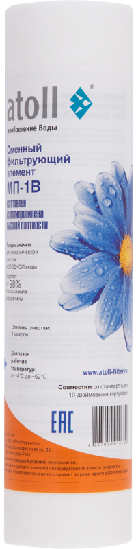 Картридж atoll МП-1В для механической фильтрации воды эффективно удаляет из нее нерастворимые загрязнения, такие как глина, песок, частицы ржавчины и другие. Может использоваться как в быту, так и в коммерческих и промышленных установках для очистки воды.