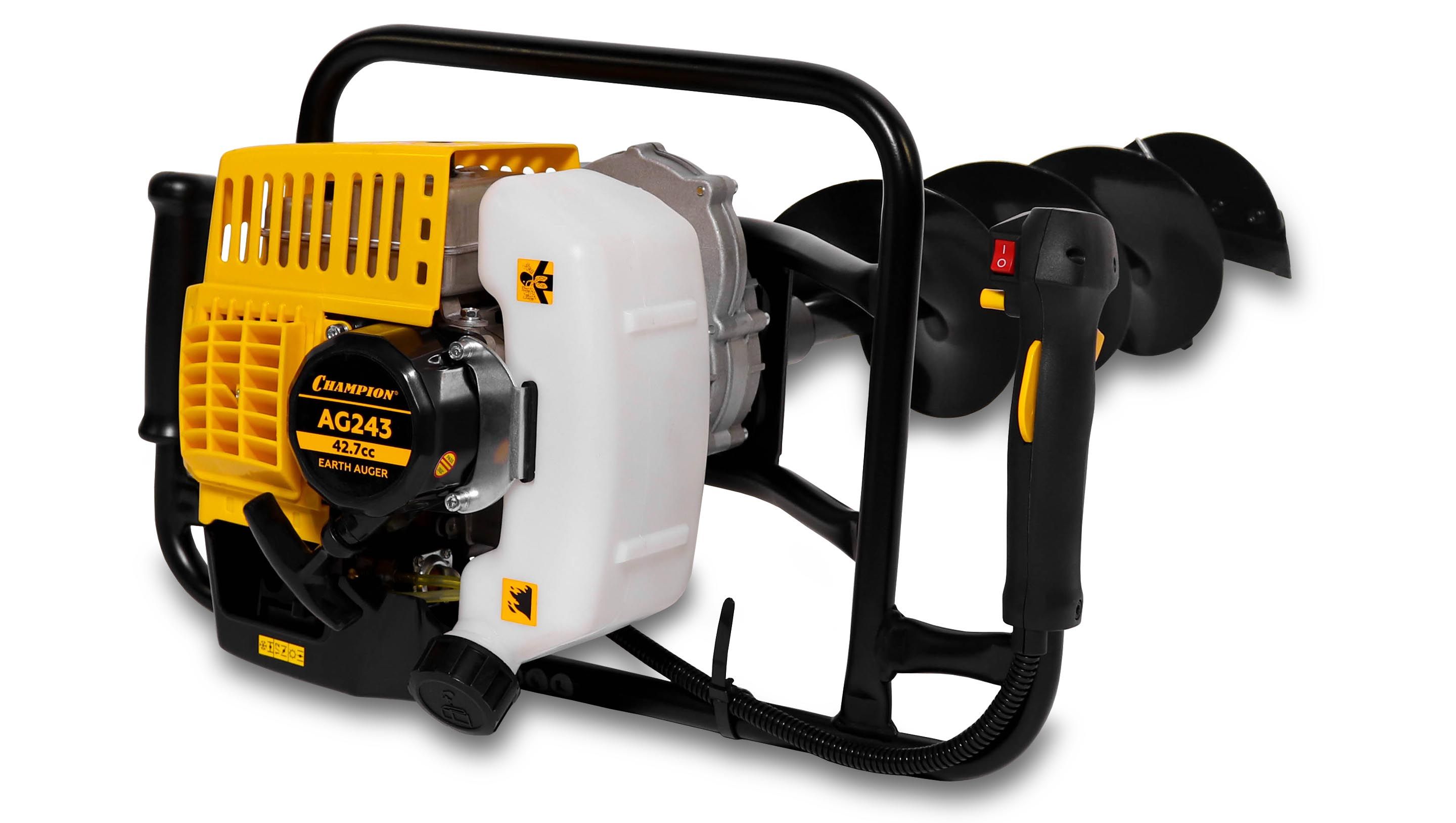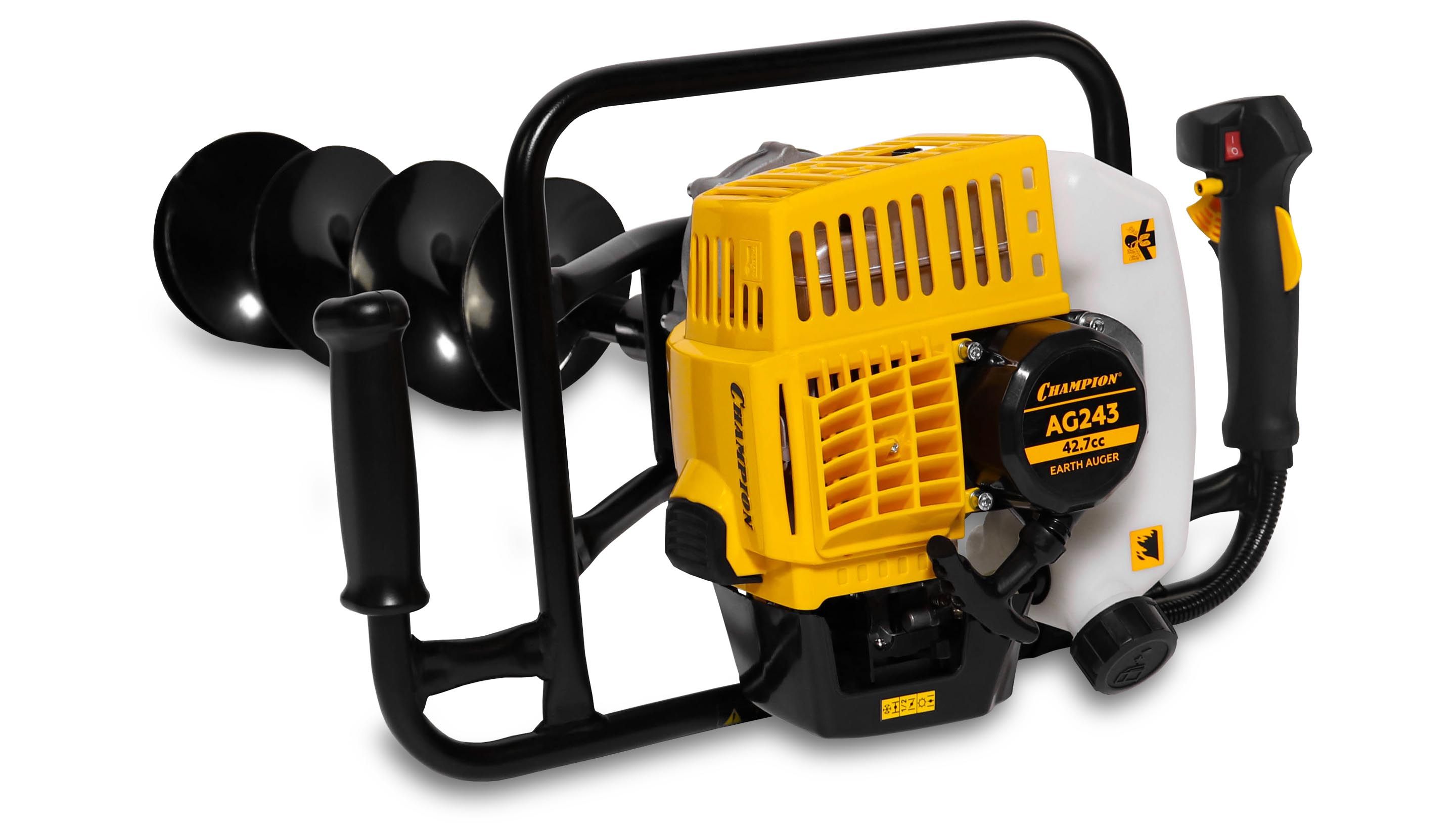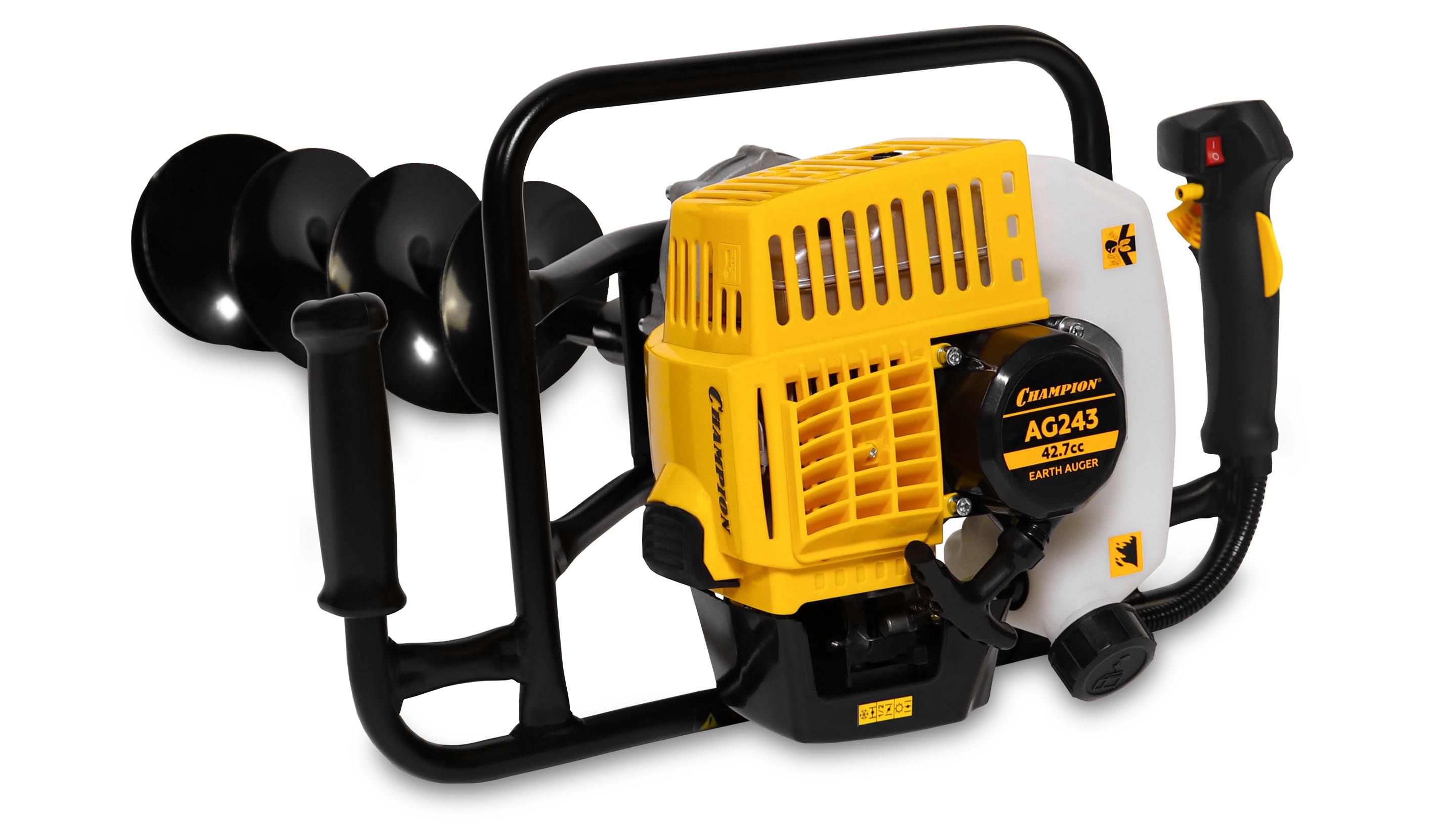 Мотобур CHAMPION AG243 (1,25кВт 42,7см³ 9,2кг шнек150*550) - предназначен для бурения отверстий в грунте, а также во льду. Он используется в строительстве, сельском хозяйстве, для установки столбов и посадки деревьев.