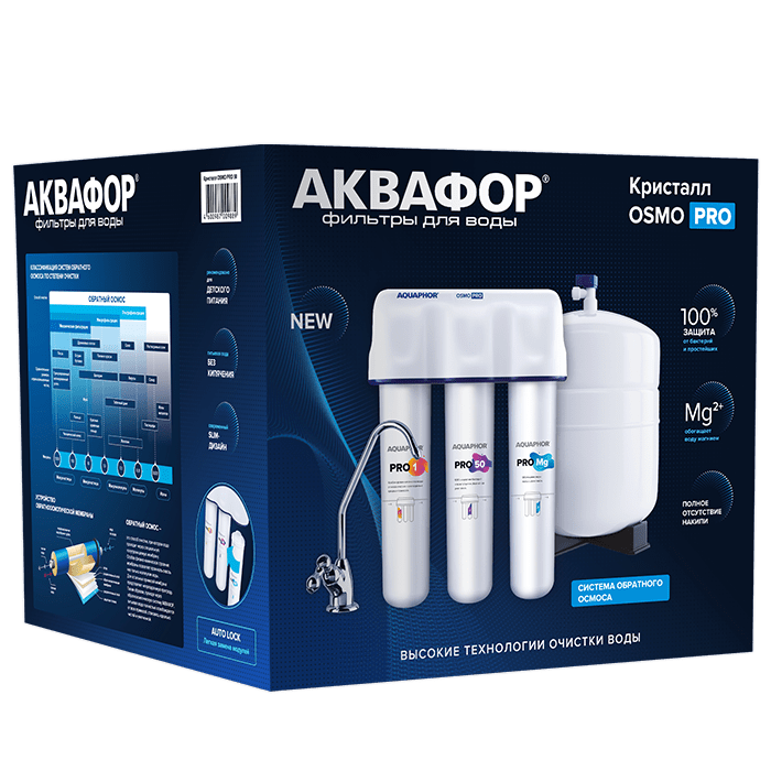 Водоочиститель Аквафор OSMO Pro-100-3-А-М — обеспечивает ультратонкую фильтрацию, удаляя из воды токсичные вещества, бактерии и вирусы. Это надёжная альтернатива бутилированной воде для ежедневного использования: приготовления напитков и пищи, детского питания, а также работы бытовой техники.