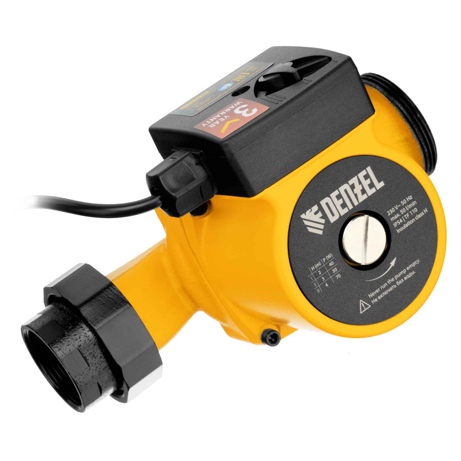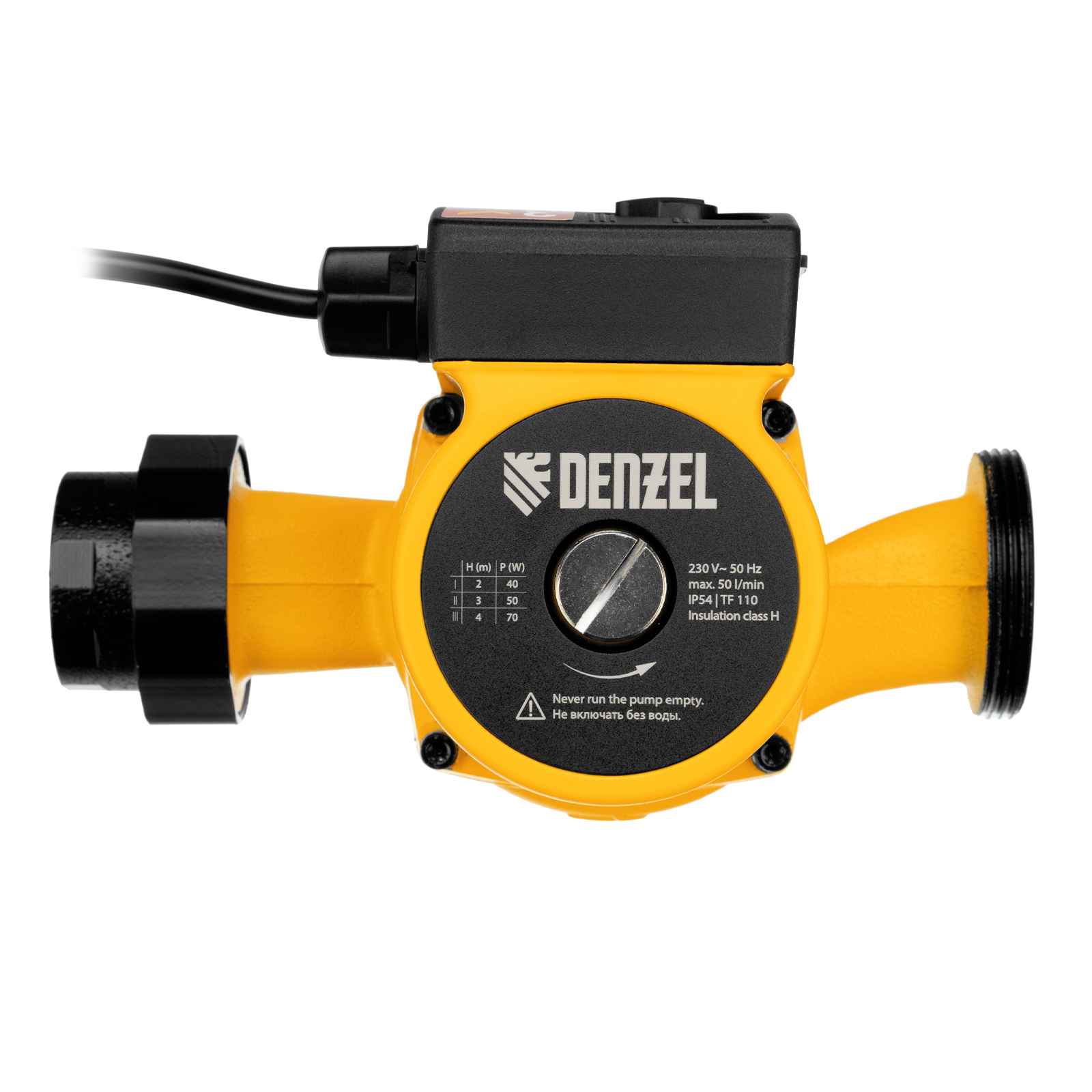 Циркуляционный насос Denzel — прокачивает через себя теплоноситель, нагретый до определённой температуры, и двигает жидкость по трубопроводу, обеспечивая нужный поток скорости. Чаще всего теплоносителем является вода. Циркуляционный насос состоит из корпуса, вала, крыльчатки, ротора и выходных патрубков. Двигатель вращает ротор, придавая ускорение теплоносителю.