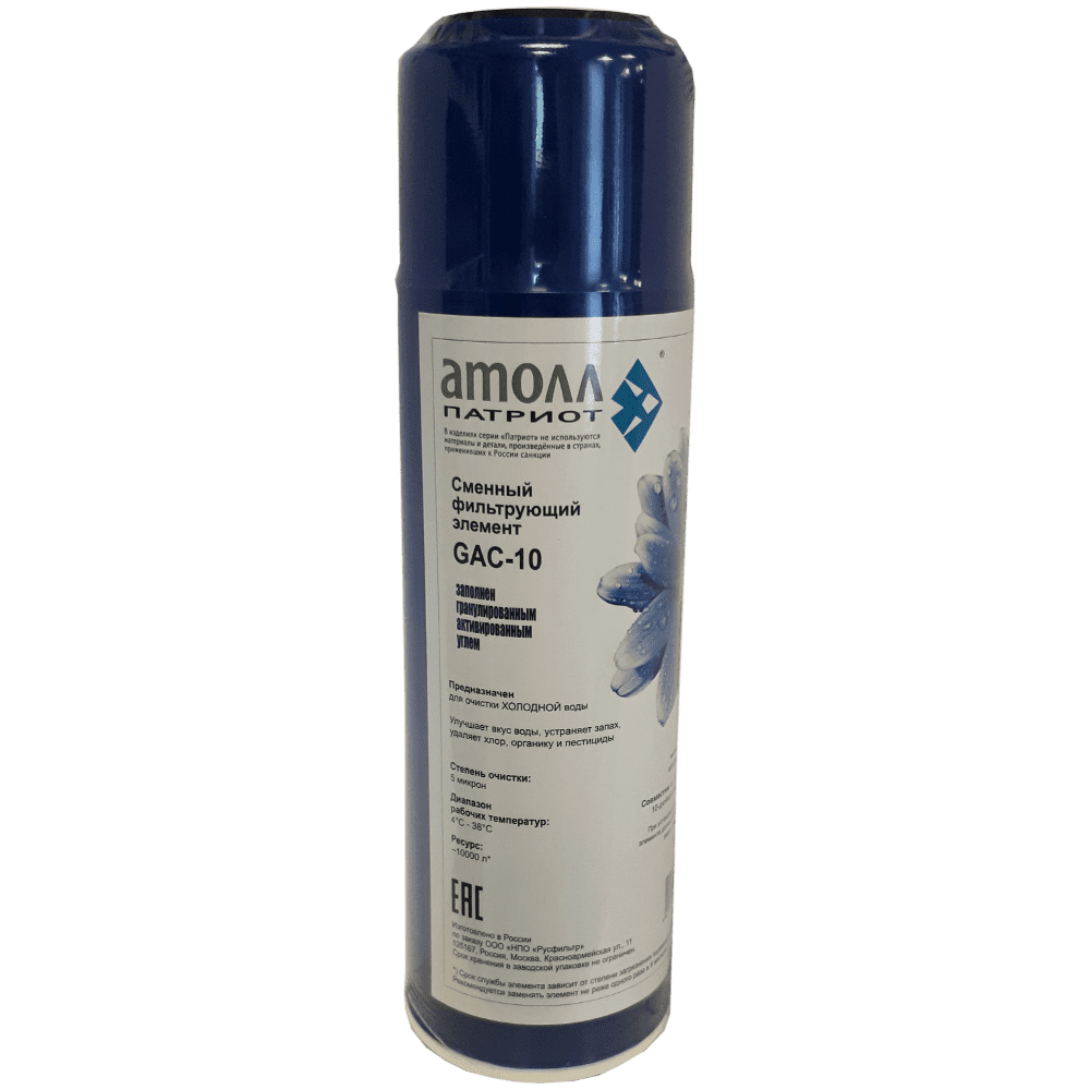 Картридж atoll GAC-10 Патриот предназначен для очистки воды от свободного хлора, органических соединений и улучшения органолептических свойств воды. Сочетает небольшое сопротивление потоку с улучшенными показателями удаления хлора по сравнению с прочими угольными фильтрами, обеспечивающими очистку от 5 микрон.